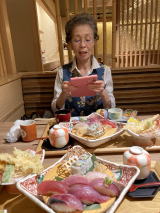 一番年長のお姉さんが足も丈夫、どこも悪い所がないのです。そしてお若く私の目標です。久し振りの豪華な食事。(旬彩にぎり御膳1780円・あんみつ\580円合計税込み¥2596円)お腹も満腹で満足満足・・・