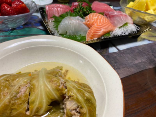 浜松町で面接が終わり夕方、多摩センター駅まで迎えに行きました。リクルートスーツを着ているので戸惑いましたがすっかり成長して頼もしい感じです。疲れもあるのに丘の上まで行き多摩センターの夜景を懐かしんでいました。夕飯はロールキャベツ・とお刺身。