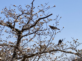 2023・3・8(水曜日) 今日は気温が20度もありすっかり春の装いになりました。 体操の帰り久し振りに駅まで歩きました。 宝の公園の直ぐ路地にミモザが満開に咲いています。 道路から外れているので気が付かない場所ですが友人と一緒だったので教えて貰いました。 コブシの花も咲き始めています。 が花をついばんでいました。