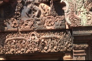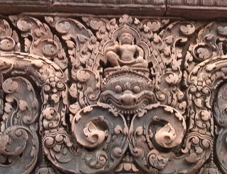 朝日観賞後ホテルに戻り朝食後遺跡巡りが始まる。パンテアイ・スレイ遺跡「女の砦」という意味だそうです。遺跡としては、小さいが、レリーフがとても綺麗で、見ていても飽きない。レリーフの彫りが深くて「東洋のモナリザ」(右の写真)と呼ばれるレリーフもありました。 1000年以上もたっているレリーフとは思えないほど、しっかりと保存されています。