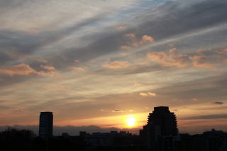 ビルの谷間から太陽が登ってきました。