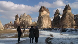 カイマル地下都市を歩きギョレメの谷、キノコ岩、スリーシスターズ、何処も雪の上に不思議な形をした奇岩群がニョッキリ、と突き上げ連立している様は圧巻でした。こうした地層は数億年前に起きたエルジエス山の噴火によって造られたもの。火山灰と溶岩が数百mずつ積み重なった末、凝灰岩や溶岩層になった。その後、浸食が進み今では硬い岩だけが残され不思議な形の岩と成ったそうです。